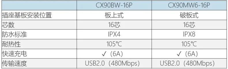 “CX90MW6-16P”是将连接器嵌入基板安装的破板式类型,由于没有安装高度,有助于设备的低薄化。此外,通过在内部使用独特结构的零件实现了高基板固定强度,结合外壳所具备的螺丝孔,在安装后进行螺丝固定,可以进一步提高固定强度。作为对环境的特性,实现了IPX8的高防水性能。“CX90BW-16P”和“CX90MW6-16P”都具有105℃的高耐热性,并且还支持6A高电流的高速充电。